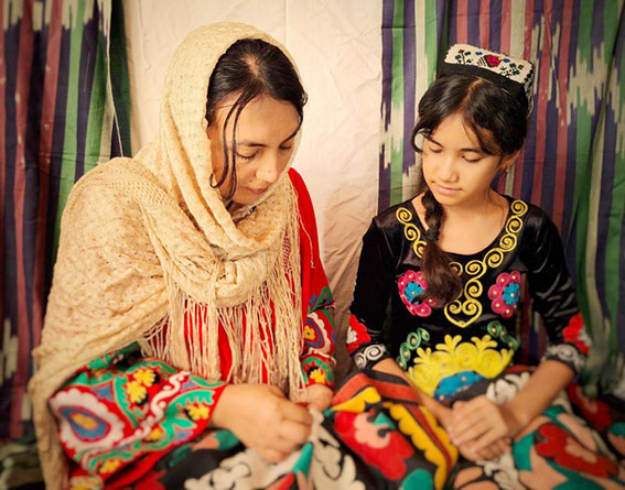 На фотографии изображён трогательный момент передачи традиций. Мать обучает дочь искусству вышивки сюзане — древнему наследию Шёлкового пути, в каждом стежке заключены история, забота и тепло поколений.