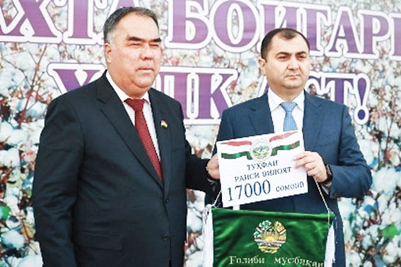 В торжественной обстановке председатель Согдийской области Раджаб Ахмазода вручил председателю Спитаменского района Темуру Нумонзода вымпел, денежную премию в размере 17 тысяч сомони и легковой автомобиль. Председатель Аштского района Шухрат Мухамадзода получил денежную премию в размере 8,5 тыс. сомони, а председатель сельского джамоата «Хуррамзамин» Элёр Улмасов – 4,5 тыс. сомони. Денежными премиями также были отмечены лучшие сборщицы хлопка и механизаторы.