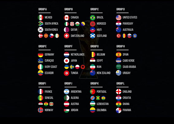 Группа A: Мексика, ЮАР, Южная Корея, победитель европейского плей-офф D (Дания/Северная Македония/Чехия/Ирландия). Группа B: Канада, Катар, Швейцария, победитель плей-офф A (Италия/Северная Ирландия/Уэльс/Босния и Герцеговина). Группа C: Бразилия, Марокко, Гаити, Шотландия. Группа D: США, Парагвай, Австралия, победитель плей-офф C (Турция/Румыния/Словакия/Косово). Группа E: Германия, Кюрасао, Кот-д’Ивуар, Эквадор. Группа F: Нидерланды, Япония, Тунис, победитель плей-офф B (Украина/Швеция/Польша/Албания). Группа G: Бельгия, Египет, Иран, Новая Зеландия. Группа H: Испания, Кабо-Верде, Саудовская Аравия, Уругвай. Группа I: Франция, Сенегал, Норвегия, победитель межконтинентального плей-офф 2 (Боливия/Суринам/Ирак). Группа J: Аргентина, Алжир, Австрия, Иордания. Группа K: Португалия, Узбекистан, Колумбия, победитель межконтинентального плей-офф 1 (Новая Каледония/Ямайка/ДР Конго). Группа L: Англия, Хорватия, Гана, Панама.